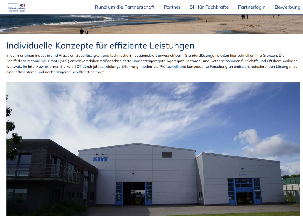 Wir freuen uns, bekannt zu geben, dass die SDT Schiffsdieseltechnik Kiel GmbH nun als Technologie- und Innovationspartner auf der Plattform von Partner.SH gelistet ist. Diese Partnerschaft erhöht unsere Sichtbarkeit innerhalb des regionalen Innovationsnetzwerks und unterstreicht unser Engagement für qualitativ hochwertige Ingenieurleistungen im maritimen und industriellen Umfeld.